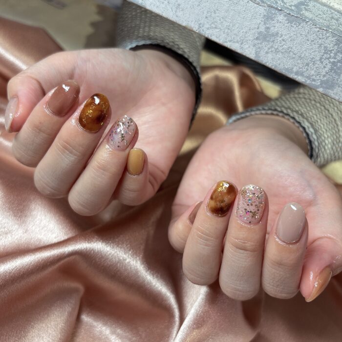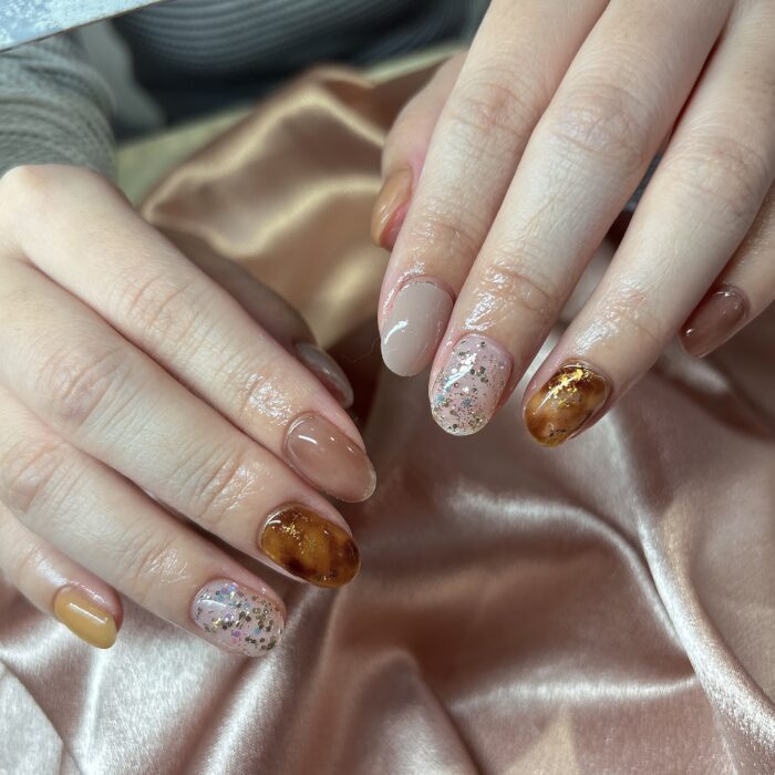 べっ甲デザインを1本ずつ入れて秋らしいネイルに