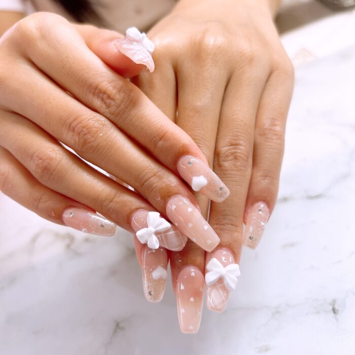 白リボンやチェック柄をメインにしたバレエコアネイルをお楽しみいただきました!