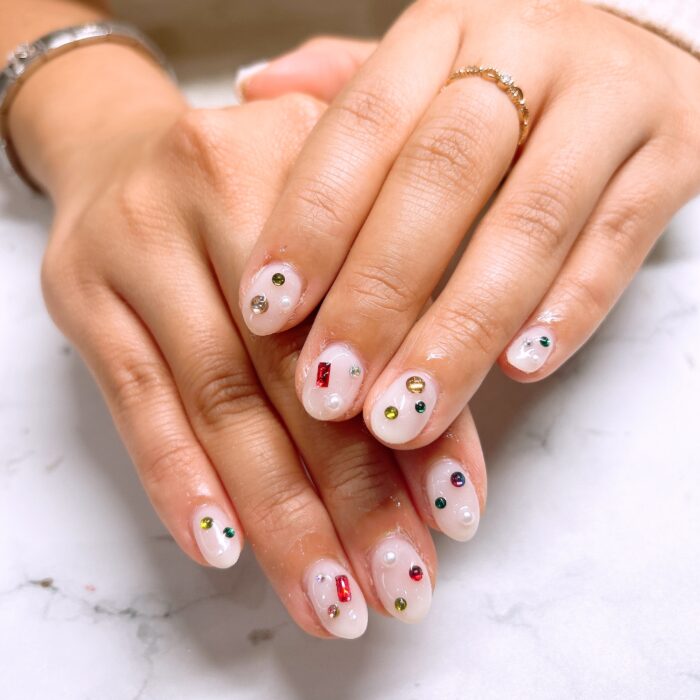 乳白色のワンカラーをベースに、カラフルなストーンを配置してデザインしました♡