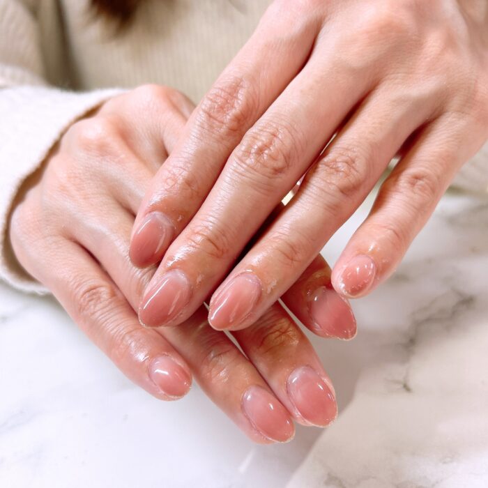 ちゅるんとしたくすみピンクのグラデーションデザインに先端のラメラインが素敵です♡