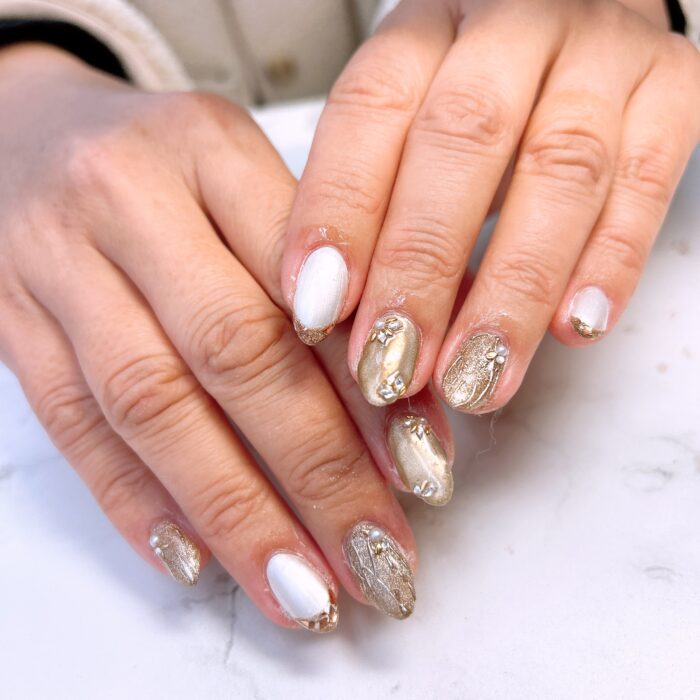 パールカラーとゴールドを組み合わせた上品なネイルに仕上がりました(*^^*)