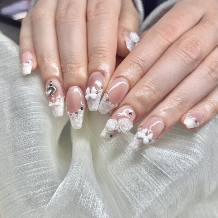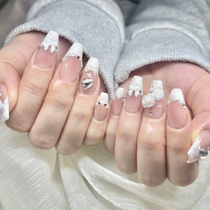 シルクフレンチにパーツを沢山のせて可愛らしいお手元になりました(*^^*)