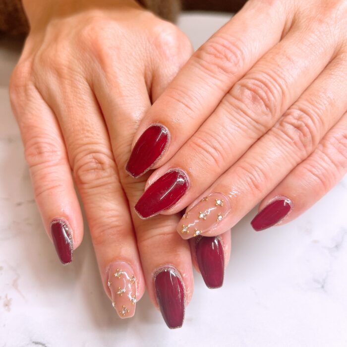 紫がかった深めの紅にラメやストーンのキラキラが良くお似合いです♡