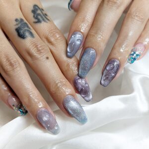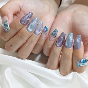 今回は、マグネットやホロを入れて梅雨ネイルで仕上げました!