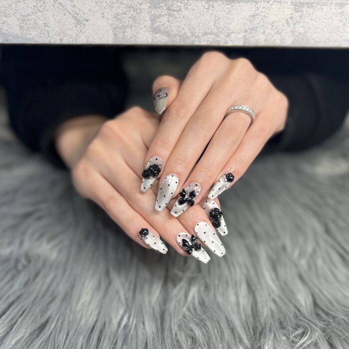 ロングなお爪にリボンとバラを合わせてでワンホン風な可愛いネイルに仕上がりました♡