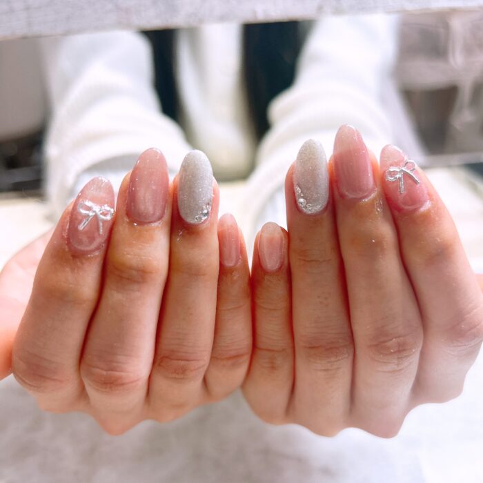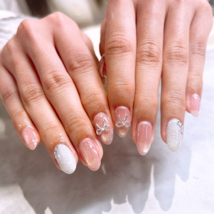 ピンクのマグネットワンカラーにポイントで白のラメを加えてアレンジしました♡
