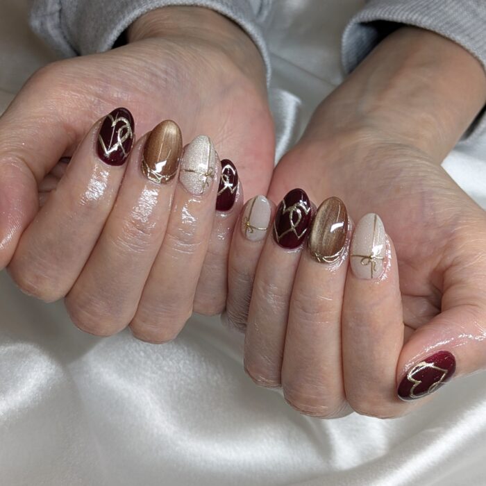 ブラウンと深みのある赤ベースにハートやリボンで
