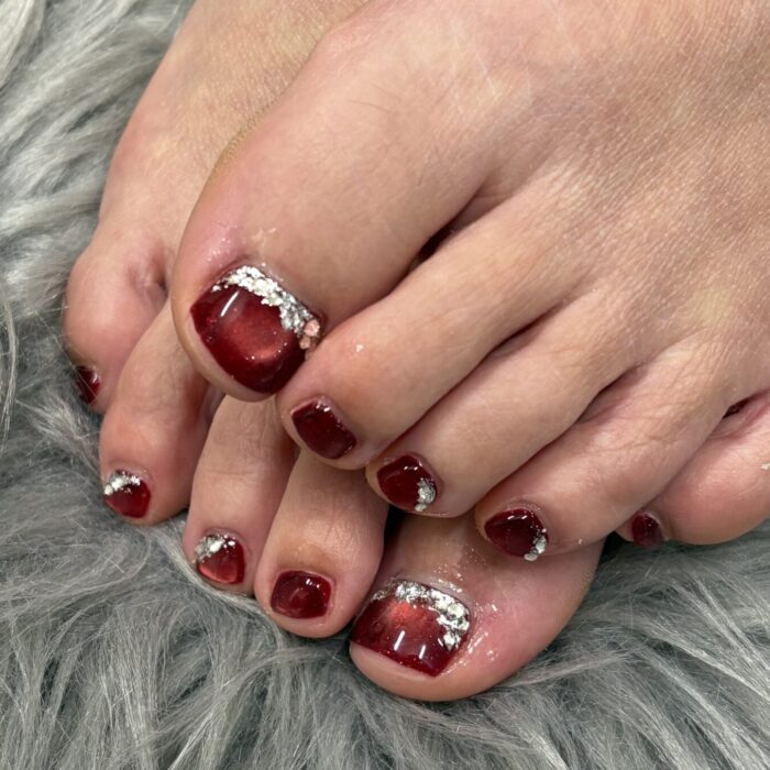 ちゅるんと見える赤のマグネットにラメとクリスタルを並べて上品な足元になりました✨