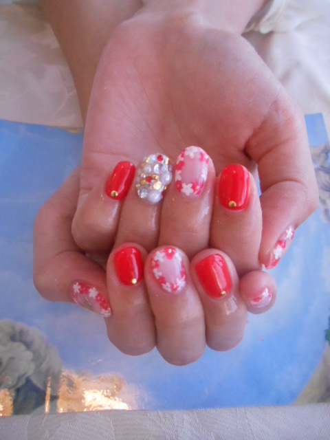 本日は秋に大人気のカラーRedと小花の囲みネイルで