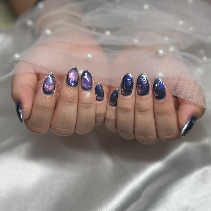 夜桜らしい青からピンクが輝くネイルに。