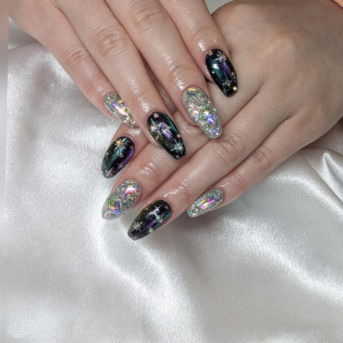 オーロラでキラキラネイル&黒ベースにマグネットを入れて♡